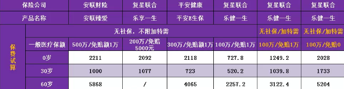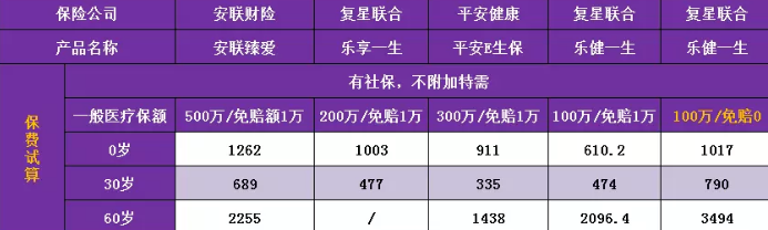 樂健一生組合方式比較多,首先看一下沒有附加社保的特需情況。同樣免賠額情況下年齡越小樂健一生保費(fèi)越低。不要擔(dān)心保額100萬或200萬,這只是一個(gè)噱頭。