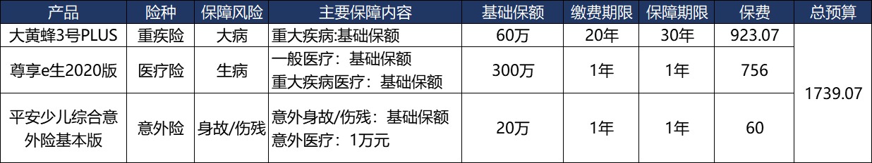 舉例說明:定期的重疾險保費923元可以保障60萬的保額,同時搭配一份百萬醫(yī)療險,保費756元可以保障300萬的報銷額度,保障家庭有足夠的錢用于給孩子治病看病、康復,維持孩子治愈后的生活水平。意外險同樣是不可少的,60元的保費可以保障20萬的保額,彌補意外帶來的傷害??傮w保費在1739.07元。