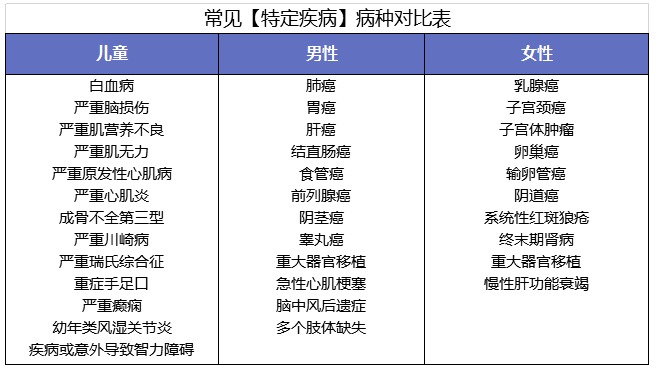 常見的特定疾病病種有下面這些,不同的產(chǎn)品可能會有所差異: