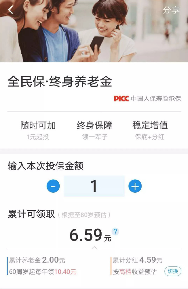 支付寶全民保·終身養(yǎng)老金,條款名叫:人保壽險(xiǎn)聚財(cái)保養(yǎng)老年金險(xiǎn)(分紅型)。背后的承保公司是中國人保集團(tuán)的“人民人壽保險(xiǎn)公司”,支付寶和他結(jié)合,可以被視為一個(gè)強(qiáng)大的聯(lián)盟。