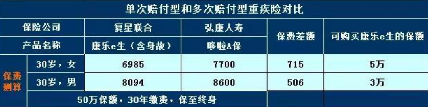 首先,我們比較一下。單個賠付嚴重疾病以復星聯(lián)合康樂e生為例子,多次賠付嚴重疾病是弘康哆啦A保為例。讓我們對比一下,看看兩種產(chǎn)品之間的區(qū)別。