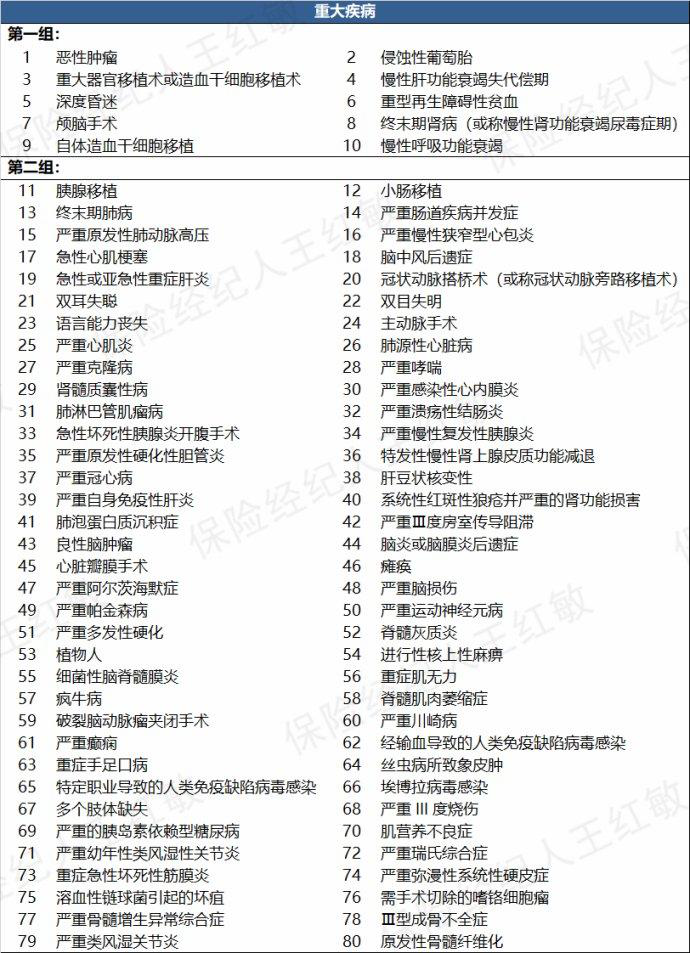 重疾80種,分兩組,第一組10種,第二組70種。每組賠付1次,100%保額,最多賠2次,間隔期1年。
