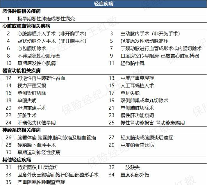 5、輕癥疾病35種不分組,沒有時間間隔,每次支付保險金額的30%,而輕癥包含幾種高發(fā)疾病,這種設置對投保人很友好。